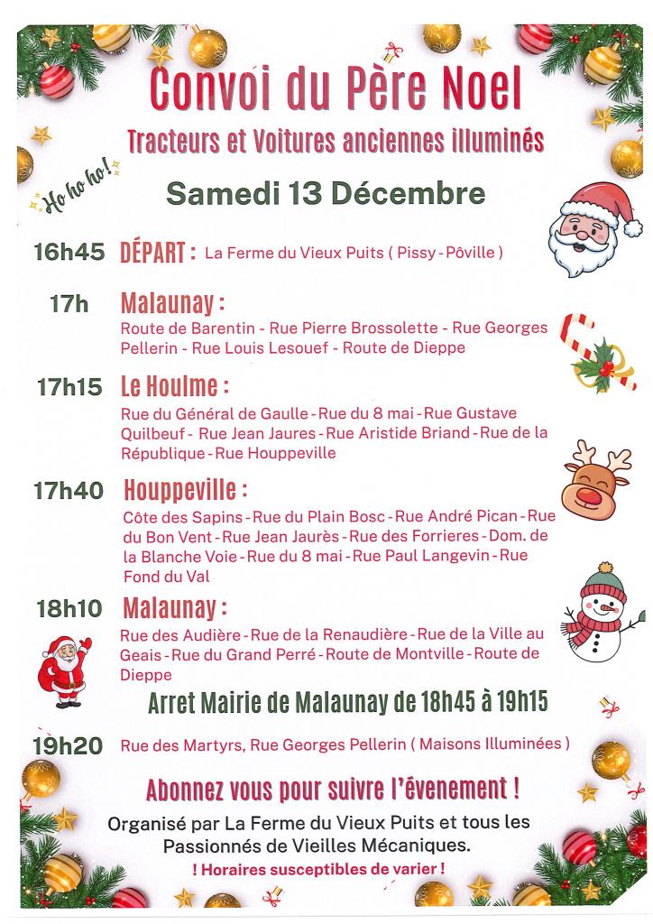 Le convoi du Père Noël passera à Houppeville le samedi 13 décembre afin d'apporter la magie de Noel avec des tracteurs et voitures anciennes. Le Père Noel sera à bord d'un véhicule.